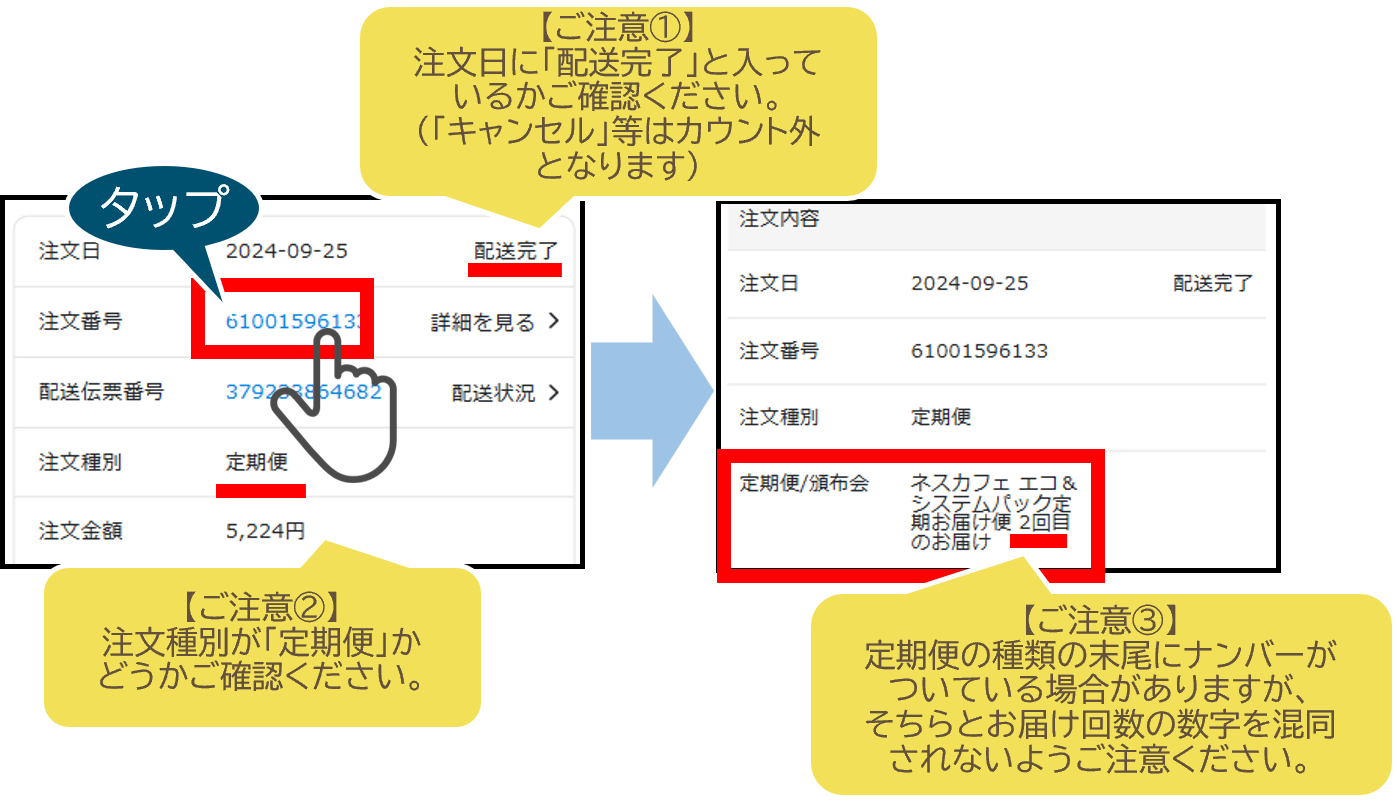 以下の手順にてご確認ください。①マイページの「注文履歴」をタップしてください。②注文番号をタップすると、注文内容に定期お届け便の種類とお届け回数が記載されているのでそちらをご参照ください。